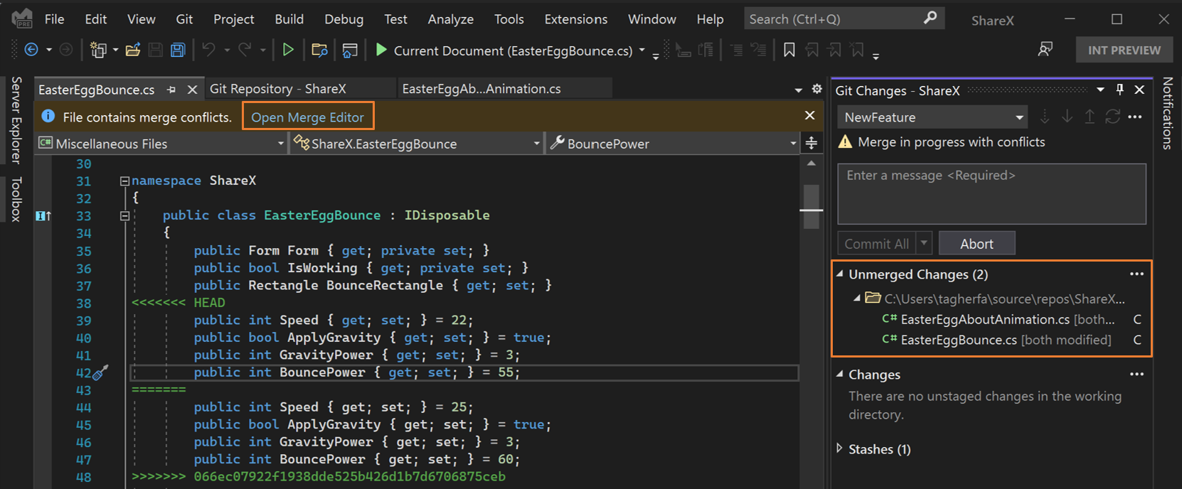 The Git Changes window shows a list of files with conflicts under Unmerged Changes. To start resolving conflicts, double-click a file. Or if you have a file with conflicts opened in the editor, you can select Open Merge Editor.