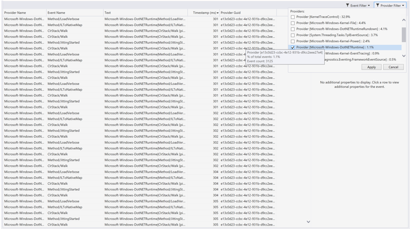 The event viewer displays up to 20,000 events at a time. To focus on the events of interest, you can filter the display of events by selecting the Event filter. You can also see what percentage of the total number of events occurred for each provider, and this information gives you a breakdown of where your time is being spent. Hover over a single event filter to see a tooltip that shows the: