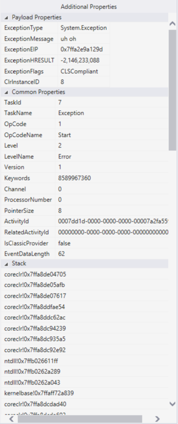 When you select an event, the Additional Properties window appears. Common Properties shows the list of properties that will appear for any event. Payload Properties shows properties specific to the event. For some events, you can also view Stacks.