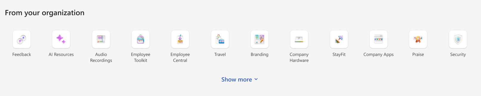 | Resources | The Connections resources experience enables way finding across popular destinations. Organizations can curate a list of useful links that appear to users such as health benefits, important forms, and department websites. |