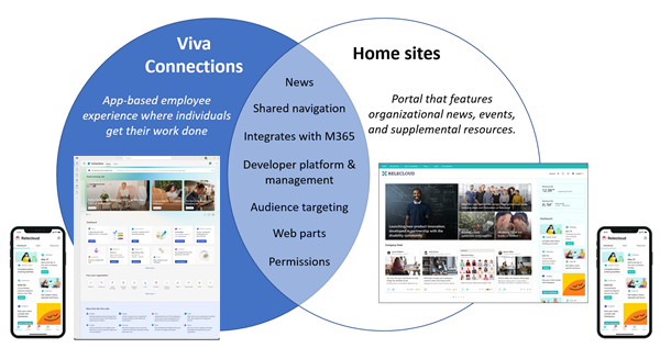 Both share many common capabilities like news roll ups, navigation, and partner extensibility to ensure these solutions work together. Both types of experiences share basic functionality, like the ability to use audience targeting, distribute organizational news, industry news, and share the same permissions model to make it easy for editors to access and manage.