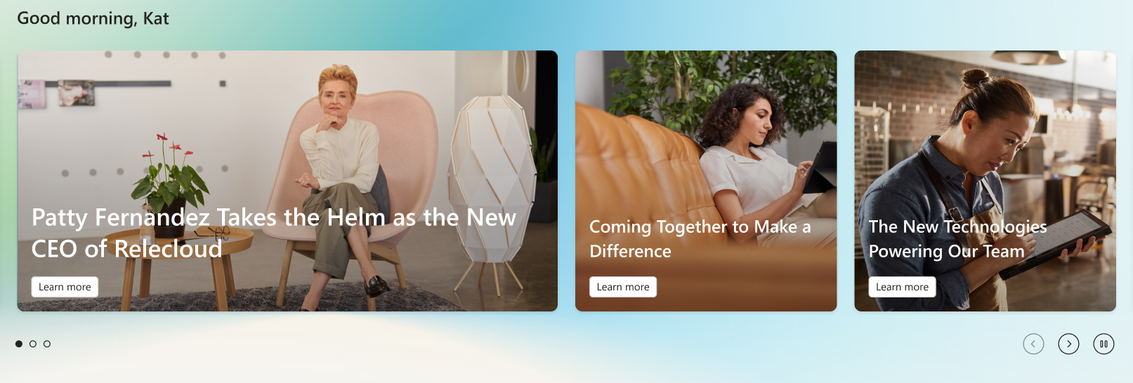 The spotlight sits at the top of the Connections experience and displays content from the home site, news from SharePoint sites, or links to articles or sites, providing a steady stream of information. Users can select links and news stories as they cycle through or use the navigation controls to scroll through the banner. If no items are available to display, this section collapses.