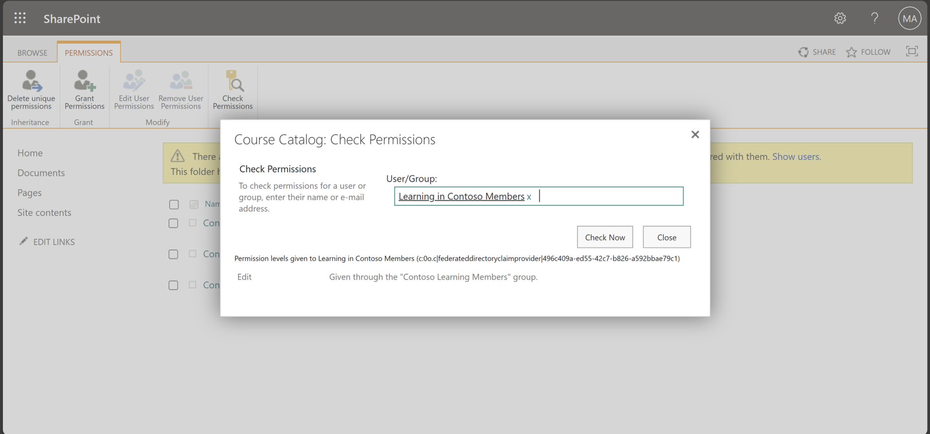 You can collect document library folder urls from any available SharePoint site in your organization. You can only choose to connect one SharePoint site with Viva Learning at one time. Viva Learning follows all existing content permissions. Therefore, only content for which a user has permission to access is searchable and visible within Viva Learning. Any content within these folders is searchable, but only content to which the individual employee has permissions can be used.