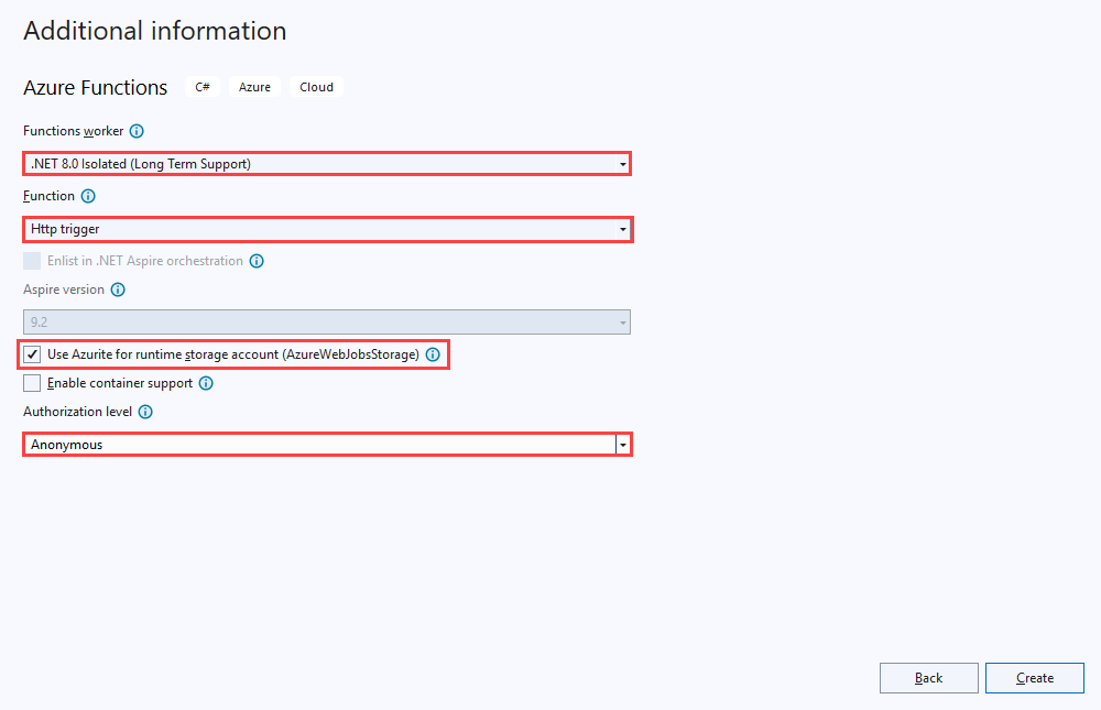 Instelling Handeling Beschrijving Functions-werkrol Selecteer .NET 8.0 Geïsoleerd (langetermijnondersteuning). Visual Studio maakt een functieproject dat wordt uitgevoerd in een geïsoleerd werkproces. Het geïsoleerde werkproces ondersteunt ook andere versies van .NET en .NET Framework die geen langetermijnondersteuning (LTS) bieden. Voor meer informatie, zie Azure Functions runtime versions overview. Function Selecteer HTTP-trigger. Visual Studio maakt een functie die wordt geactiveerd door een HTTP-aanvraag. Azurite gebruiken voor runtime-opslagaccount (AzureWebJobsStorage) Schakel dit selectievakje in. Omdat een functie-app in Azure een opslagaccount vereist, wordt er een toegewezen of aangemaakt wanneer u uw project naar Azure publiceert. Een HTTP-trigger maakt geen gebruik van een verbindingsreeks voor een opslagaccount. Voor alle andere triggertypen is een geldige verbindingsreeks voor het opslagaccount vereist. Autorisatieniveau Selecteer Anoniem. Wanneer u deze autorisatie-instelling gebruikt, kan elke client de gemaakte functie activeren zonder een sleutel op te geven. Met deze configuratie kunt u uw nieuwe functie eenvoudig testen. Voor meer informatie, zie Authorization level. Instelling Handeling Beschrijving Functions-werkrol Selecteer .NET 8.0 In-process (langetermijnondersteuning). Visual Studio maakt een functieproject dat in uitvoering wordt uitgevoerd met versie 4.x van de Functions-runtime. Voor meer informatie, zie Azure Functions runtime versions overview. Function Selecteer HTTP-trigger. Visual Studio maakt een functie die wordt geactiveerd door een HTTP-aanvraag. Azurite gebruiken voor runtime-opslagaccount (AzureWebJobsStorage) Schakel dit selectievakje in. Omdat een functie-app in Azure een opslagaccount vereist, wordt er een toegewezen of aangemaakt wanneer u uw project naar Azure publiceert. Een HTTP-trigger maakt geen gebruik van een verbindingsreeks voor een opslagaccount. Voor alle andere triggertypen is een geldige verbindingsreeks voor het opslagaccount vereist. Autorisatieniveau Anoniem selecteren Wanneer u deze autorisatie-instelling gebruikt, kan elke client de gemaakte functie activeren zonder een sleutel op te geven. Met deze configuratie kunt u uw nieuwe functie eenvoudig testen. Voor meer informatie, zie Authorization level. Zorg ervoor dat je het Authorization level instelt op Anonymous. Als u het standaardniveau van de functie selecteert, moet u de functiesleutel presenteren in aanvragen voor toegang tot uw functie-eindpunt.