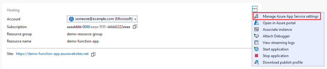 Ga op de publicatieprofielpagina naar de sectie Hosting . Selecteer het beletselteken (...) en selecteer vervolgens Openen in Azure Portal. De Azure-portal wordt geopend voor de functie-app waarin uw project is geïmplementeerd.