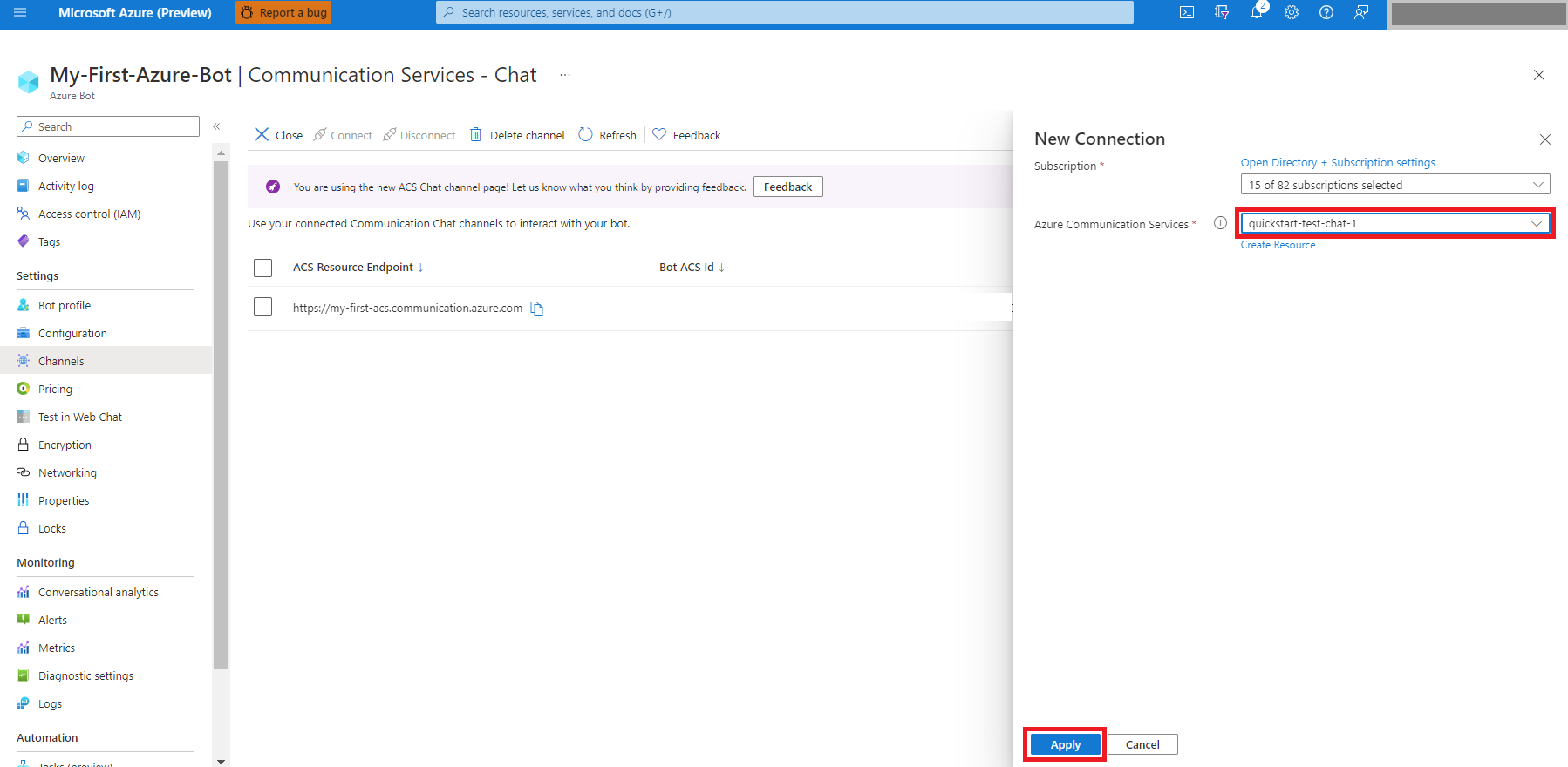 Selecteer in het deelvenster Nieuwe verbinding de Communication Services-chatresource en selecteer vervolgens Toepassen.