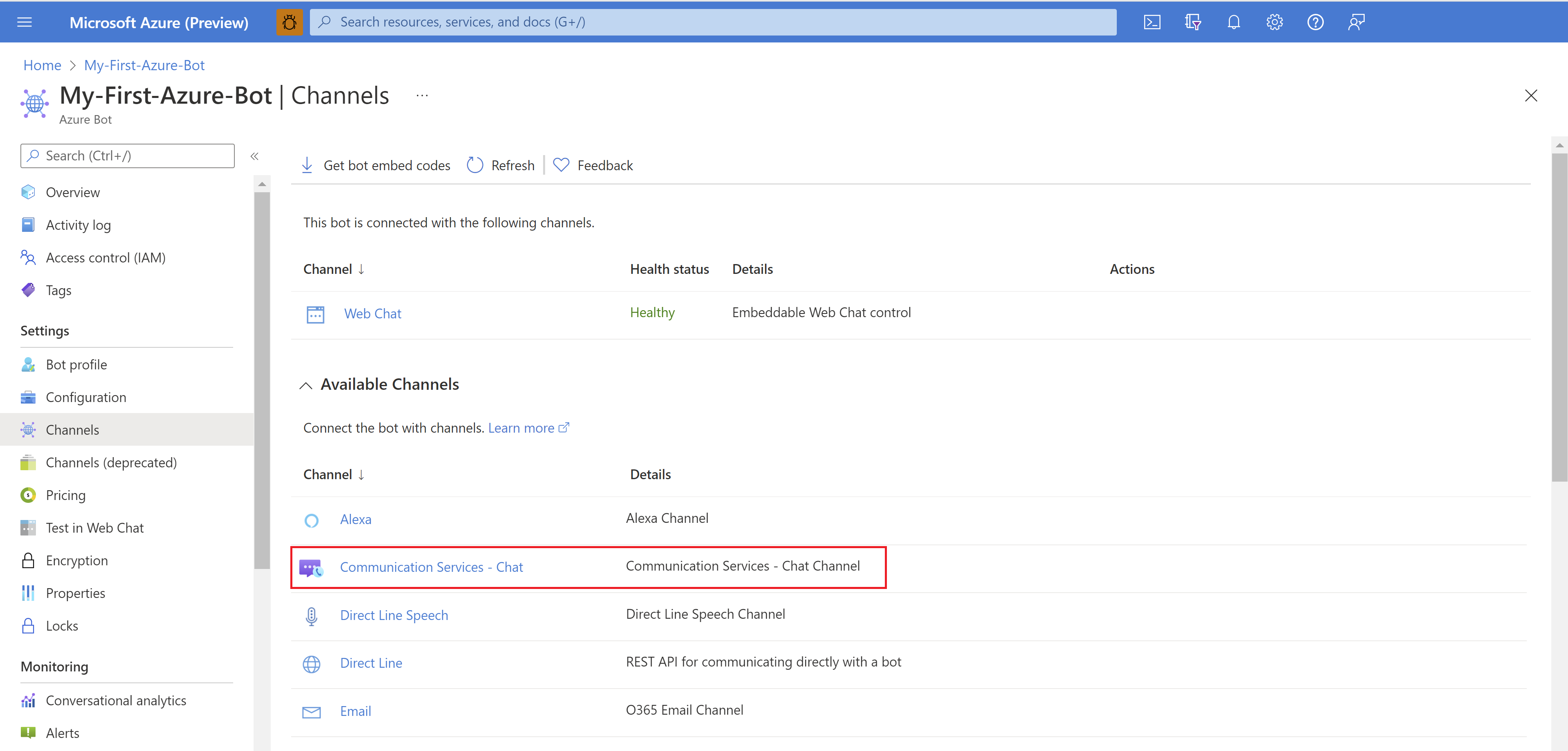 Ga in Azure Portal naar uw Azure Bot-resource. Selecteer Kanalen in het resourcemenu. Selecteer Azure Communications Services - Chat in de lijst met beschikbare kanalen.
