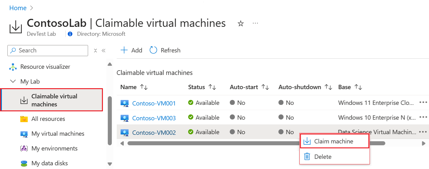 Vouw op de pagina Overzicht van lab de sectie Mijn lab in het linkermenu uit en selecteer Claimbare virtuele machines.