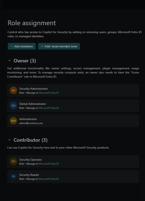 Security Copilot RBAC roles are not Microsoft Entra roles. Security Copilot roles are defined and managed within Copilot and only grant access to Security Copilot features.