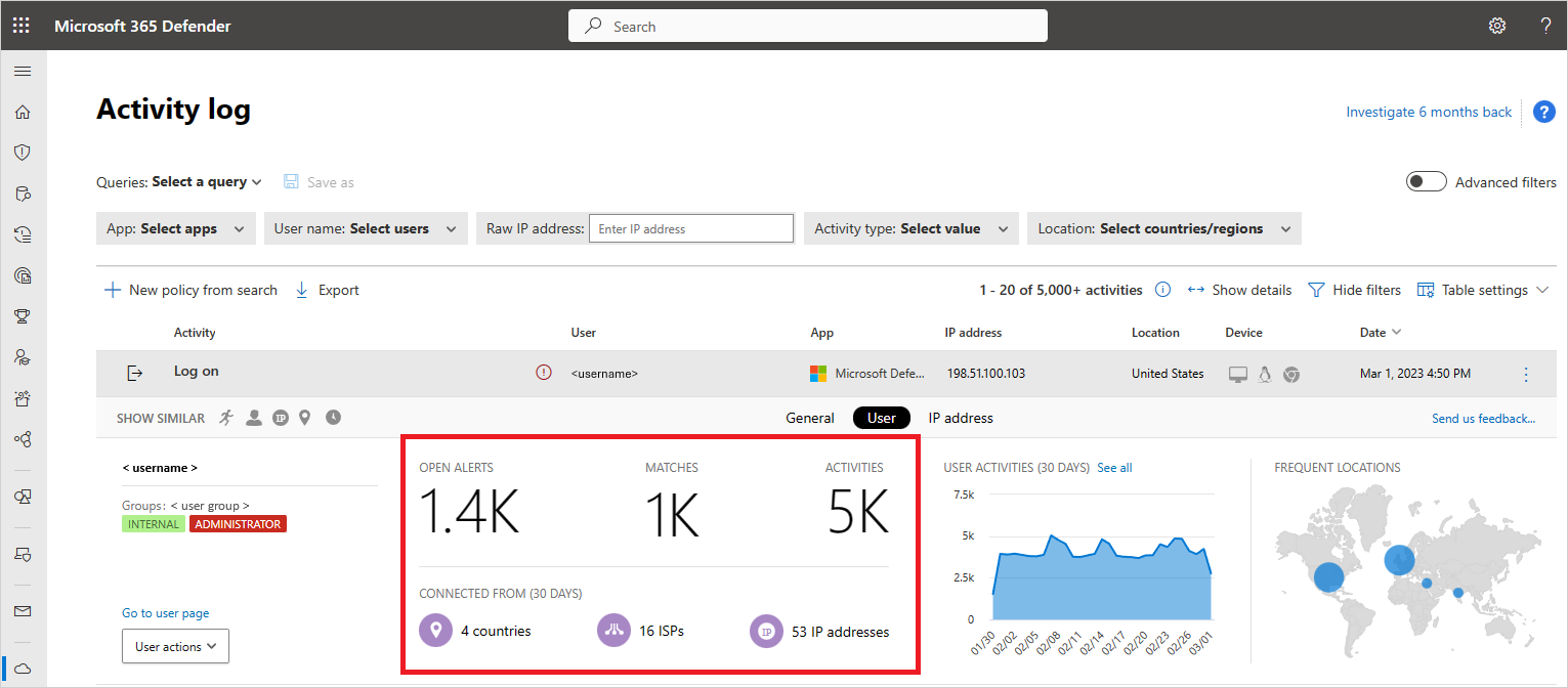 In het activiteitenlogboek kunt u een activiteit openen om de activiteitslade weer te geven. Selecteer Gebruiker om het tabblad Gebruikersinzichten weer te geven. Dit tabblad bevat informatie zoals het aantal waarschuwingen, activiteiten en waar ze verbinding mee hebben gemaakt. Dit is belangrijk bij een onderzoek.