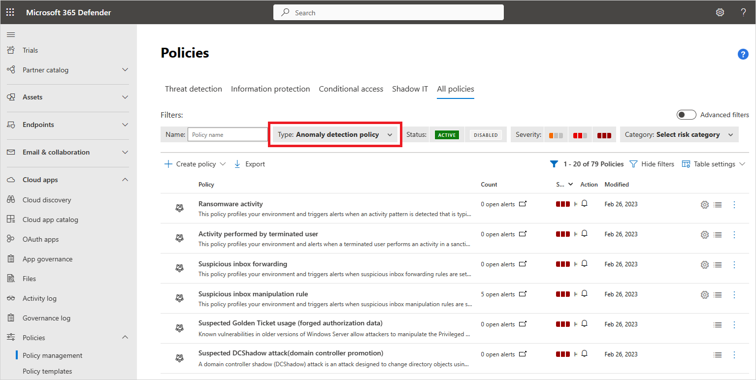 Ga in de Microsoft Defender Portal naar Cloud Apps ->Beleid ->Beleidsbeheer. Kies vervolgens Anomaliedetectiebeleid voor het beleidstype.