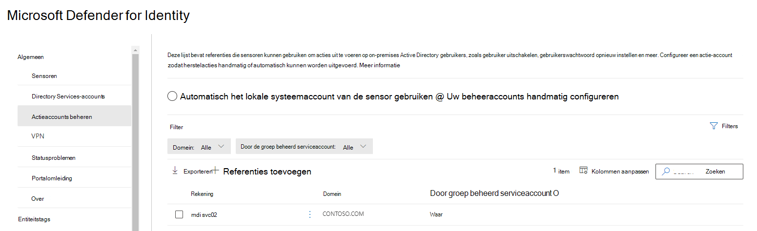 Ga naar de Microsoft Defender-portal en selecteer Instellingen ->Identiteiten>Microsoft Defender for Identity>Actieaccounts>beheren+Nieuw account maken.