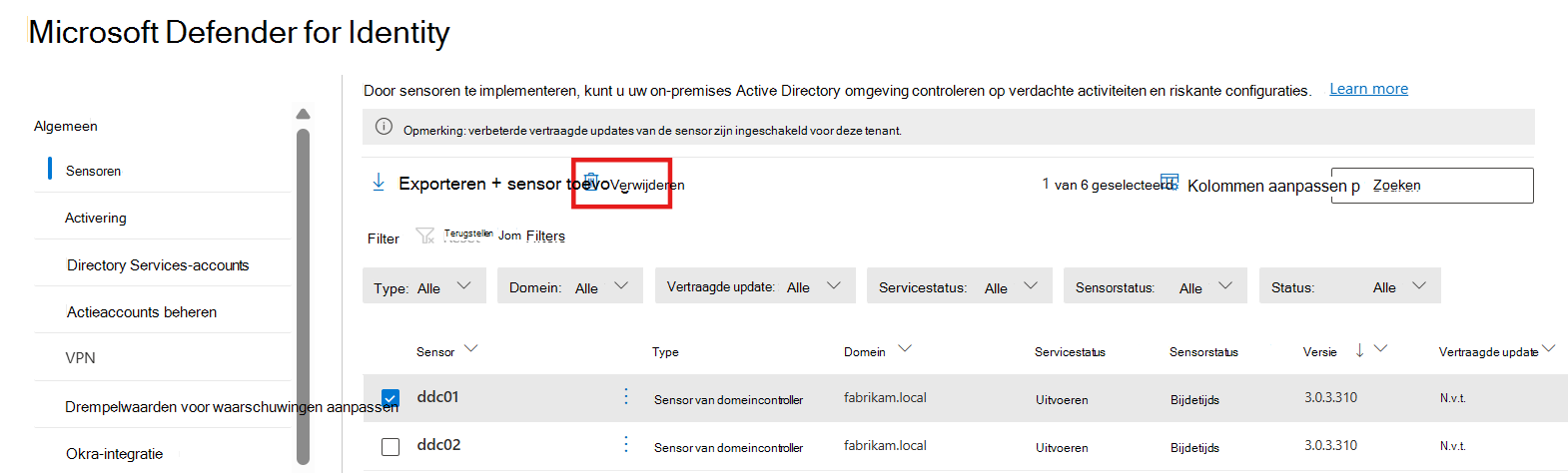 - Nadat het verwijderen is voltooid, gaat u naar de Microsoft Defender portal > Instellingen > Identiteiten > Sensoren, selecteert u de domeincontroller en kiest u Verwijderen.