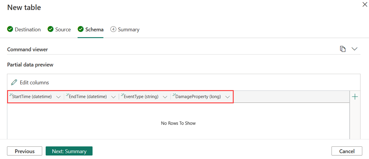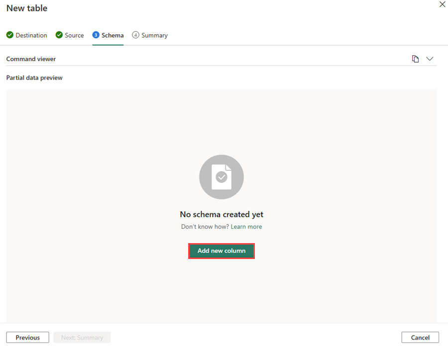 Met het hulpprogramma wordt het schema automatisch afgeleid op basis van uw gegevens. Als u een schema zonder gegevensbron wilt maken, moet u kolommen toevoegen onder gedeeltelijke gegevensvoorbeeld.