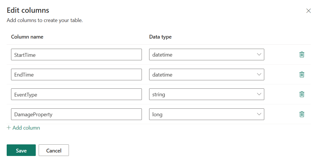 string, maar kan worden gewijzigd in de vervolgkeuzelijst van het kolomtype veld.Selecteer Kolom toevoegen om meer kolommen toe te voegen.