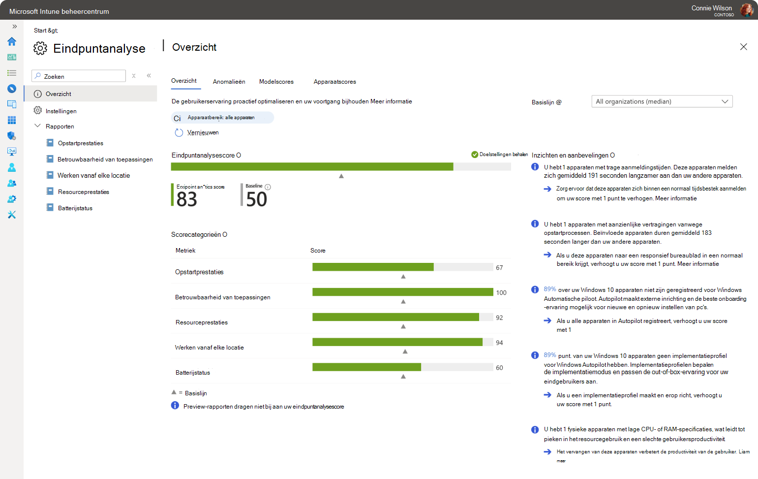 Met eindpuntanalyse kunnen IT-professionals de gebruikerservaring op beheerde apparaten beoordelen en verbeteren. Het biedt gegevensgestuurde inzichten in apparaatprestaties, opstarttijden, app-betrouwbaarheid en batterijstatus, waardoor IT-teams proactief problemen kunnen identificeren en oplossen die van invloed zijn op de productiviteit.