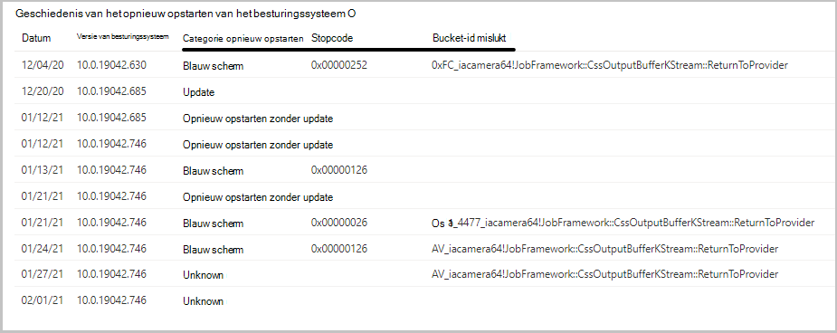 - Een bucket-id voor fouten die kan worden gebruikt voor diagnostische gegevens bij het werken met Microsoft-ondersteuning