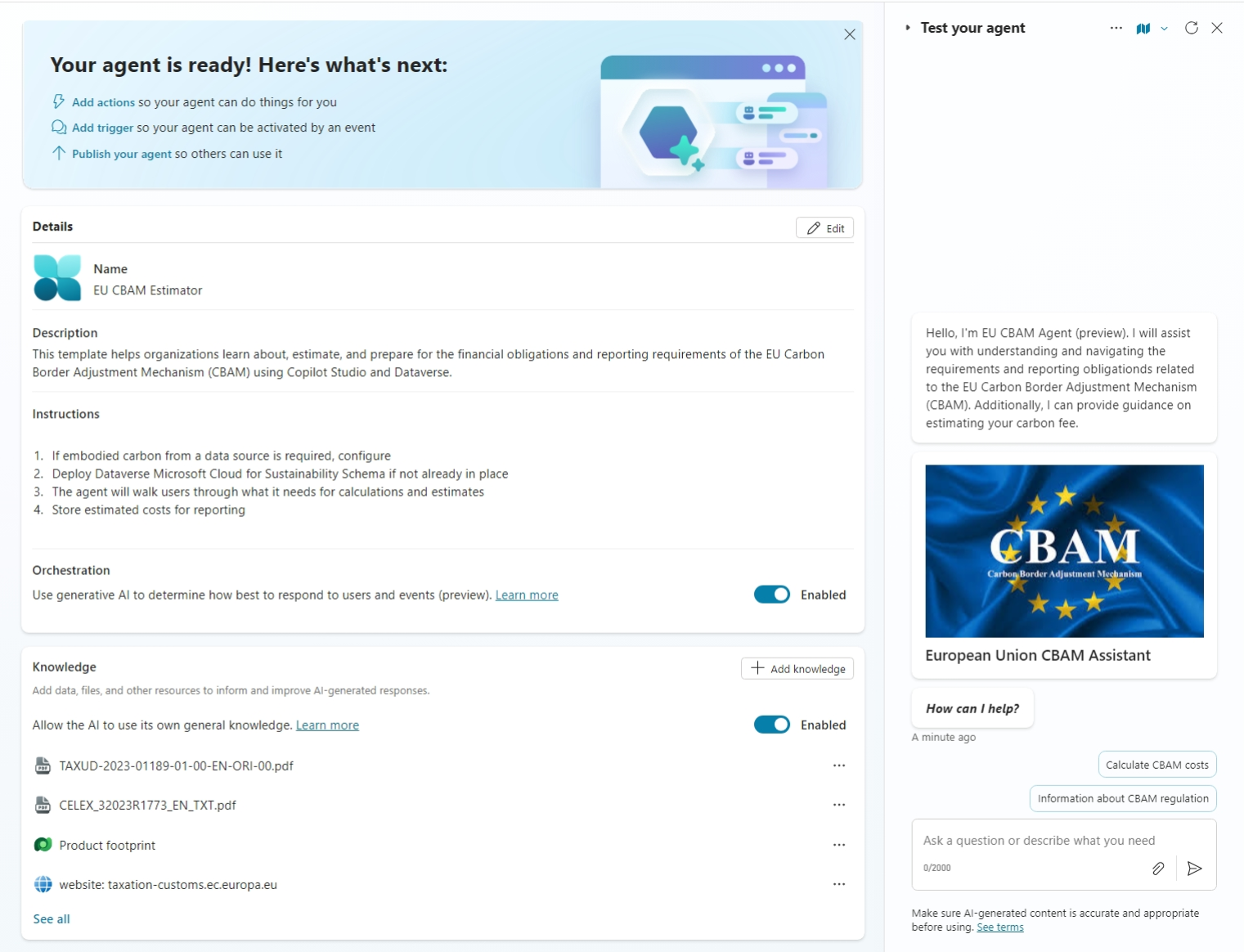 De vooraf gebouwde EU CBAM Estimator-agent maakt gebruik van de mogelijkheden van Copilot Studio om een naadloze gebruikerservaring te bieden. Deze agent maakt gebruik van specifieke kaarten en prompttechnieken om gebruikers door het proces te leiden, wat zorgt voor een hoog slagingspercentage en hoge gebruikerstevredenheid.