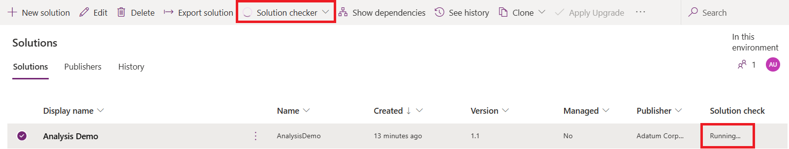 De opdrachtknop Oplossingscontrole heeft een laadindicator en u ziet de status Wordt uitgevoerd… in de kolom Oplossingscontrole van de lijst Oplossing.