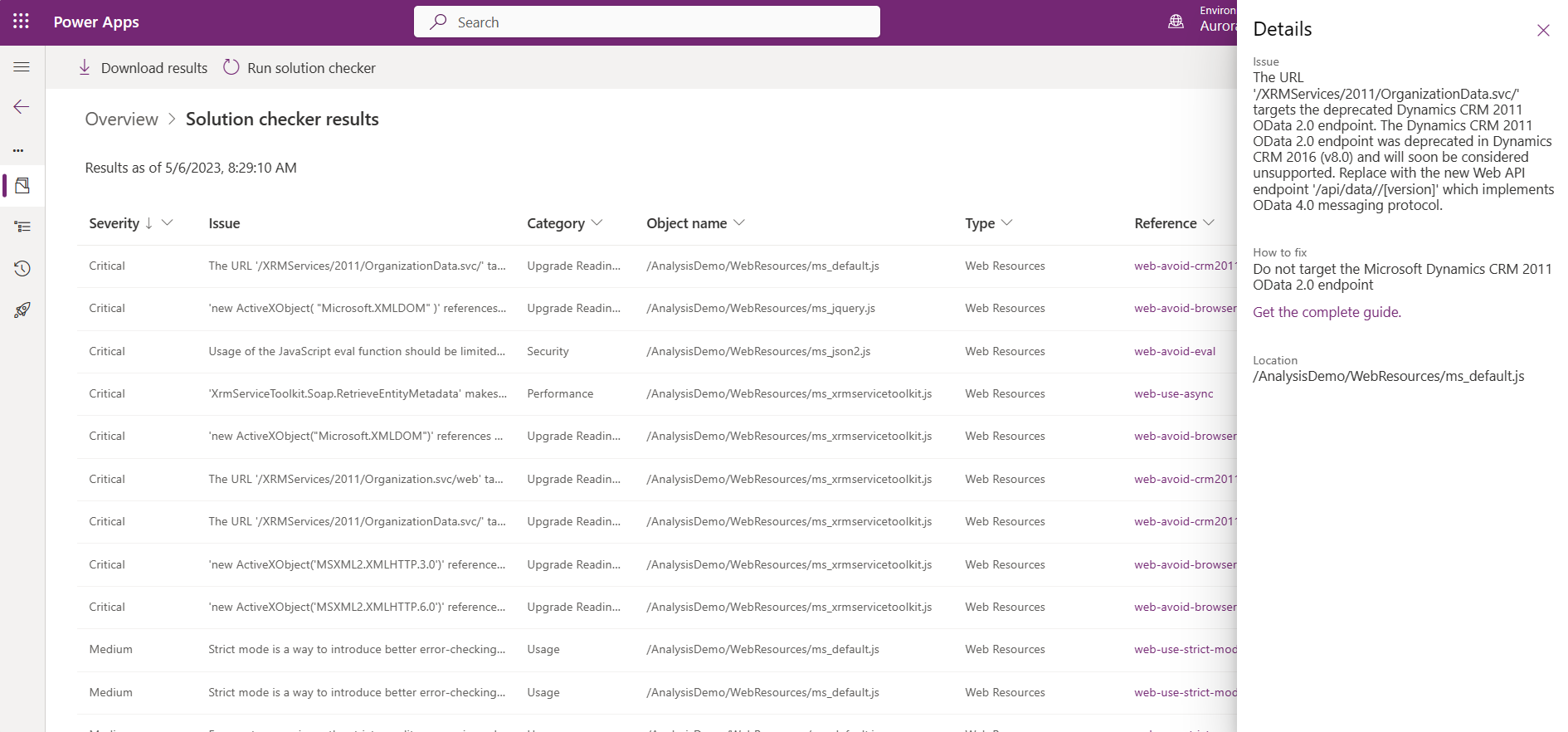 | Webresources | avoid-2011-api | Gebruik het afgeschafte Microsoft Dynamics CRM 2011-objectmodel niet. Volg in plaats daarvan de documentatie van Dataverse-web-API. | Hoog | Upgradegereedheid |