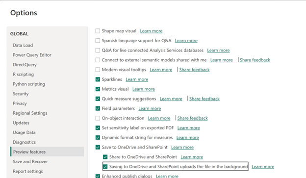 Als u uploaden op de achtergrond wilt inschakelen, selecteert u > Opties voor bestandsopties en instellingen >> preview-functies en selecteert u Opslaan in OneDrive en SharePoint uploadt u het bestand in het selectievakje op de achtergrond. Nadat u de selectie hebt uitgevoerd, moet u Power BI Desktop opnieuw starten.