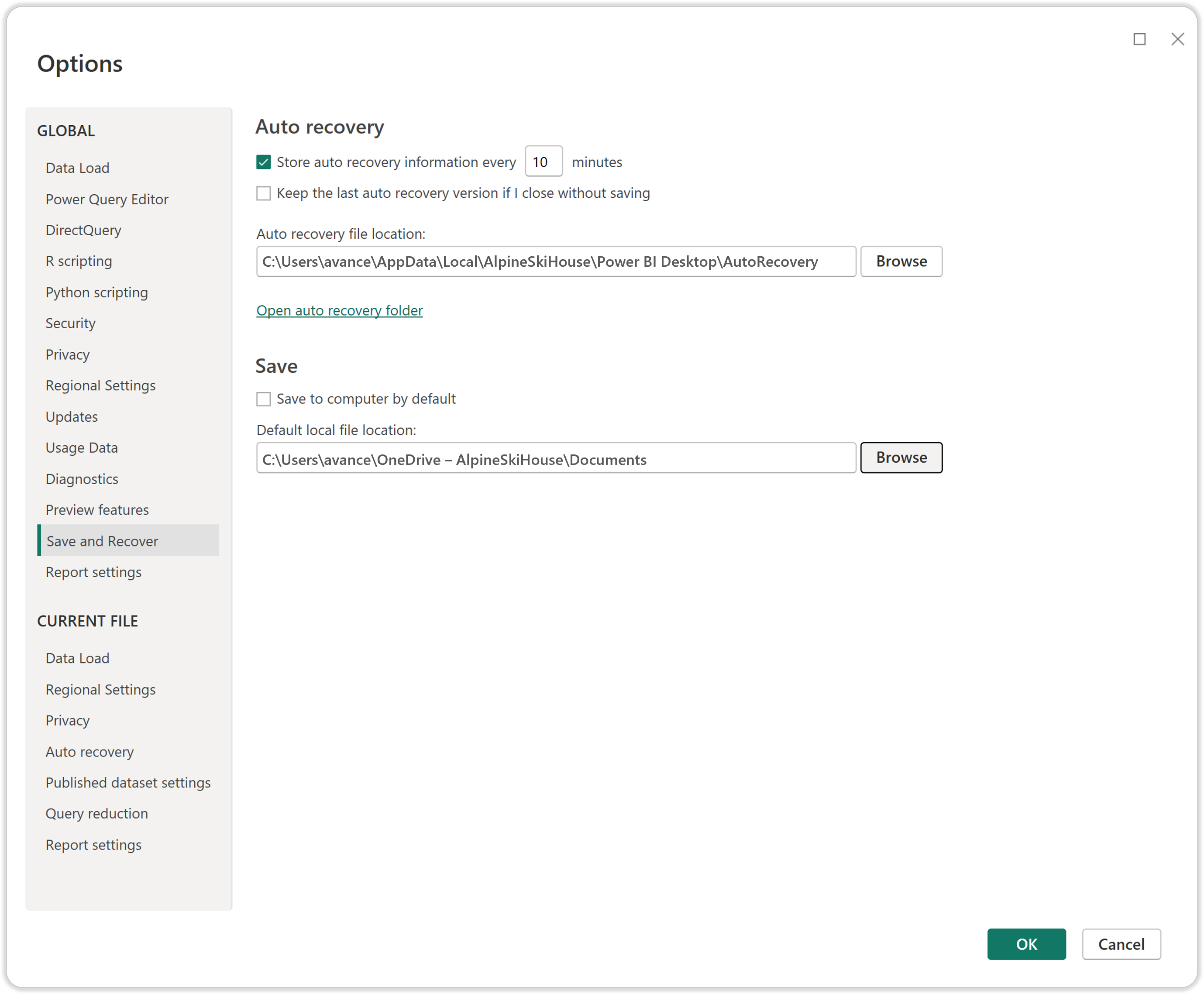 Als u het voorbeeld wilt uitschakelen voor het openen, opslaan en delen van Power BI-bestanden naar OneDrive en SharePoint in Power BI Desktop, schakelt u het selectievakje Opslaan in OneDrive en SharePoint en Delen naar OneDrive en SharePoint uit door de > Opties voor opties voor bestand en instellingen > te selecteren.