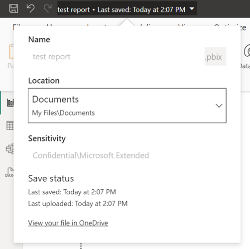 Wanneer u de titelbalk van een rapport in Power BI Desktop selecteert, kunt u de bestandslocatie alleen verplaatsen als het rapport wordt opgeslagen in OneDrive of SharePoint. U kunt de naam van het rapport niet wijzigen of het vertrouwelijkheidslabel wijzigen, ongeacht waar het bestand is opgeslagen.