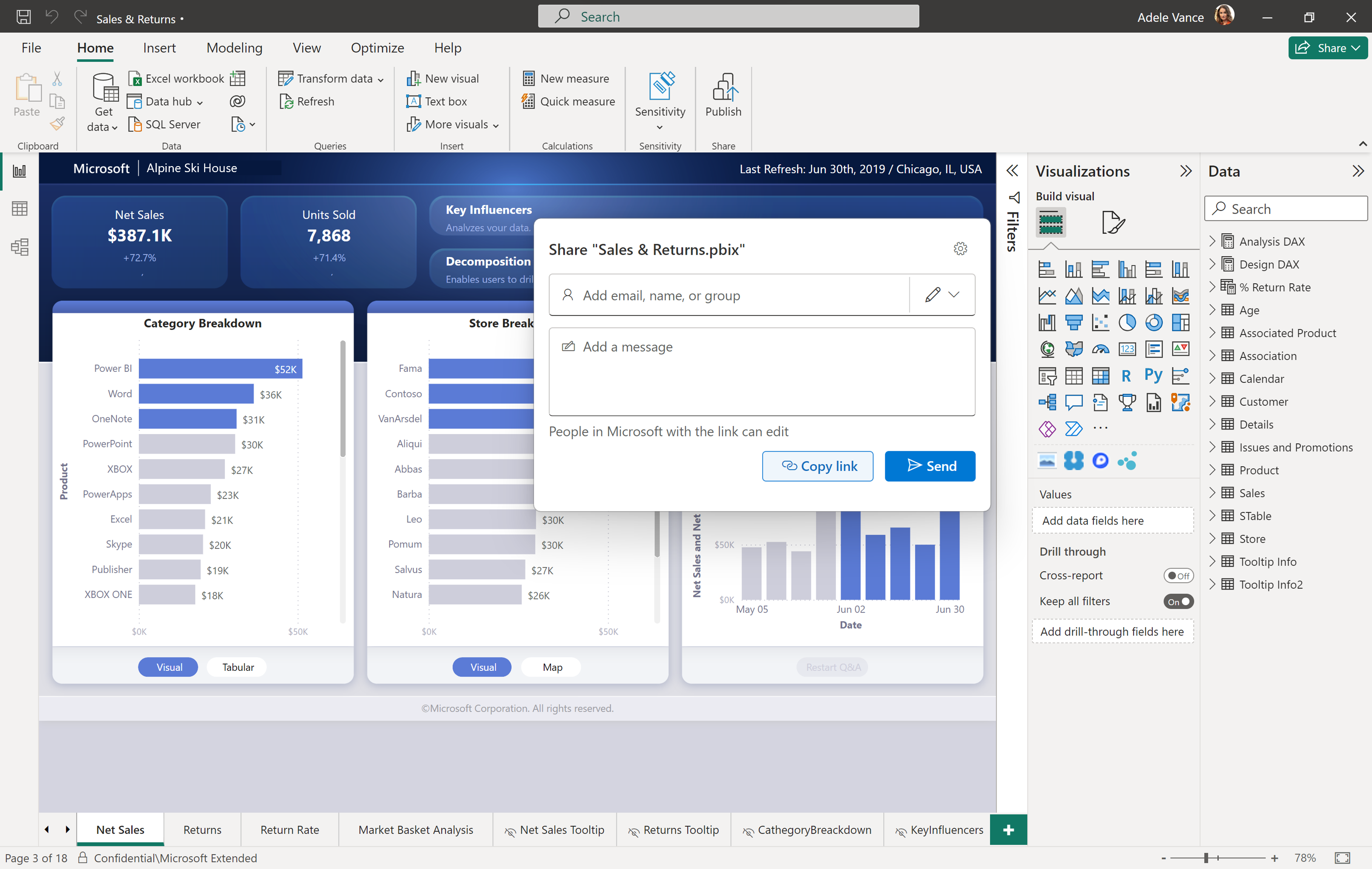 Delen via Power BI Desktop maakt gebruik van de standaardgebruikersinterface van OneDrive en SharePoint voor delen en services. Standaard power BI geconfigureerde Microsoft Information Protection-labels worden toegepast op het bestand voordat het wordt opgeslagen. Uw organisatiebeleid voor delen via OneDrive en SharePoint bepaalt wie en hoe het Power BI-item kan worden gedeeld.