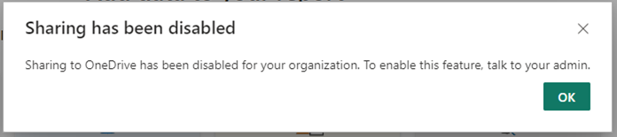 Als uw Power BI-beheerder de mogelijkheid voor uw organisatie heeft uitgeschakeld, ontvangt u een melding dat Delen is uitgeschakeld wanneer u de knop Delen selecteert. Meer informatie over de instelling Beheerder.
