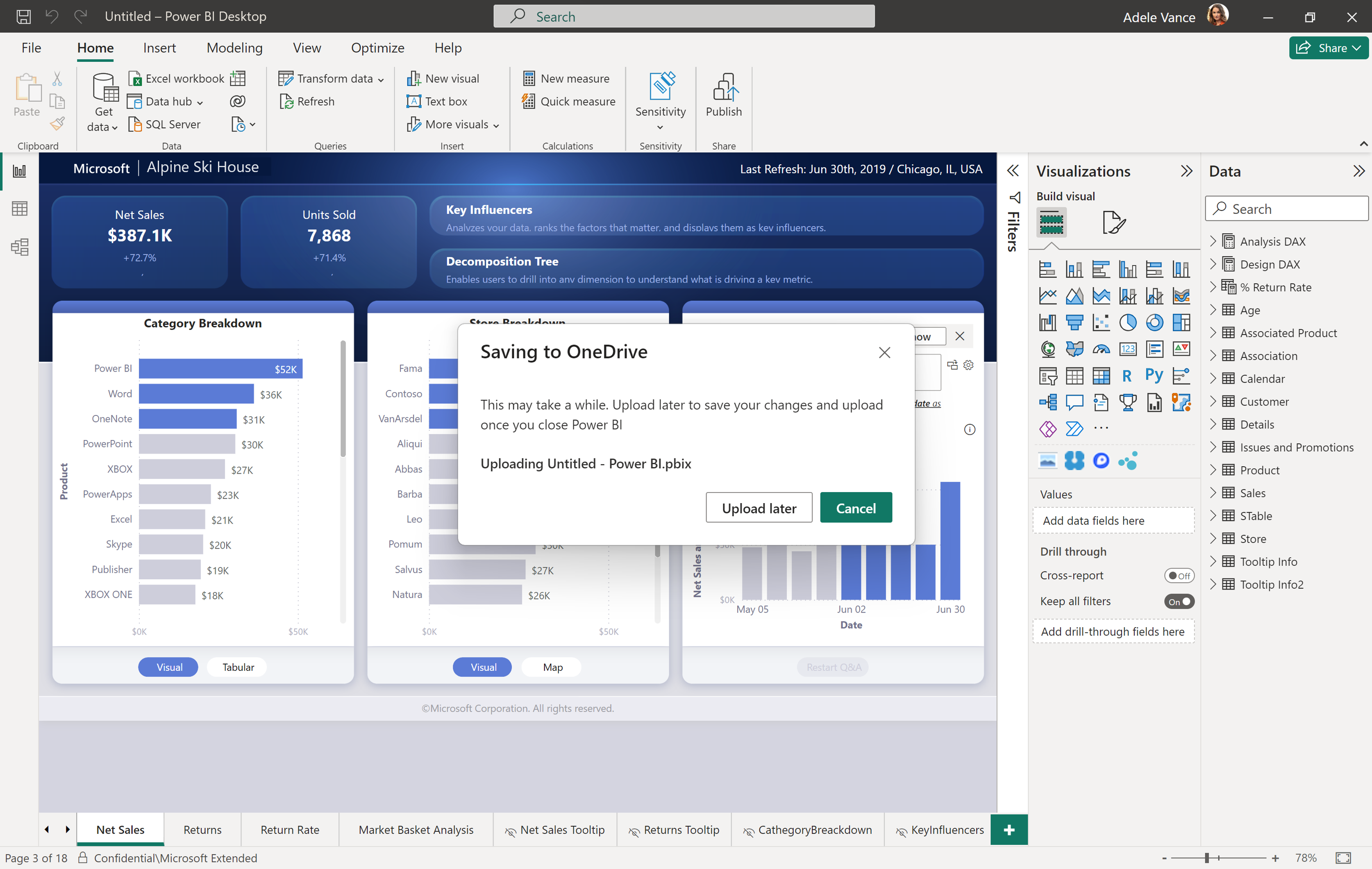 Het opslaan van een Power BI Desktop-bestand op een OneDrive- of SharePoint-locatie duurt vaak enige tijd, afhankelijk van de bestandsgrootte. Wanneer u het bestand opslaat, wordt u mogelijk uitgenodigd om het bestand later te uploaden. Als u Later uploaden selecteert, kunt u doorgaan met het werken aan het bestand en wijzigingen opnemen terwijl het uploaden naar OneDrive of SharePoint plaatsvindt nadat u Sluiten in Power BI Desktop hebt geselecteerd. De app wordt gesloten zodra het uploaden naar uw aangewezen OneDrive- of SharePoint-locatie is voltooid.