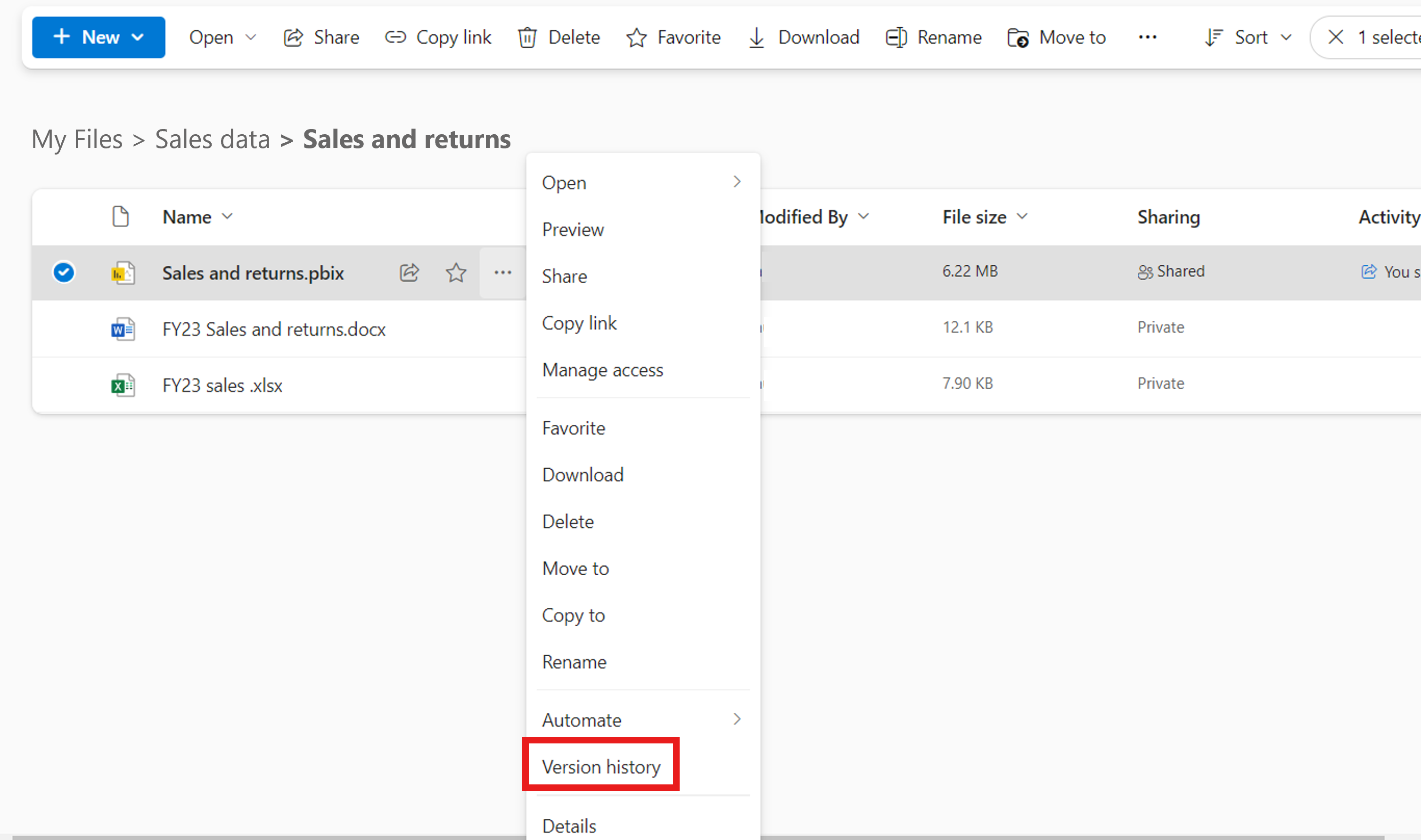 U kunt de versiegeschiedenis van uw Power BI-bestand online bekijken via uw OneDrive- of SharePoint-documentbibliotheek. Selecteer de drie puntjes rechts van het bestand en selecteer Versiegeschiedenis. Versiegeschiedenis kan niet rechtstreeks vanuit Power BI Desktop worden weergegeven.