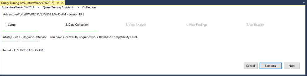 Het QTA-venster kan worden gesloten terwijl de workload wordt uitgevoerd. Terugkeren naar de sessie die op een later tijdstip actief blijft, wordt hervat vanuit dezelfde stap waar deze was gebleven.