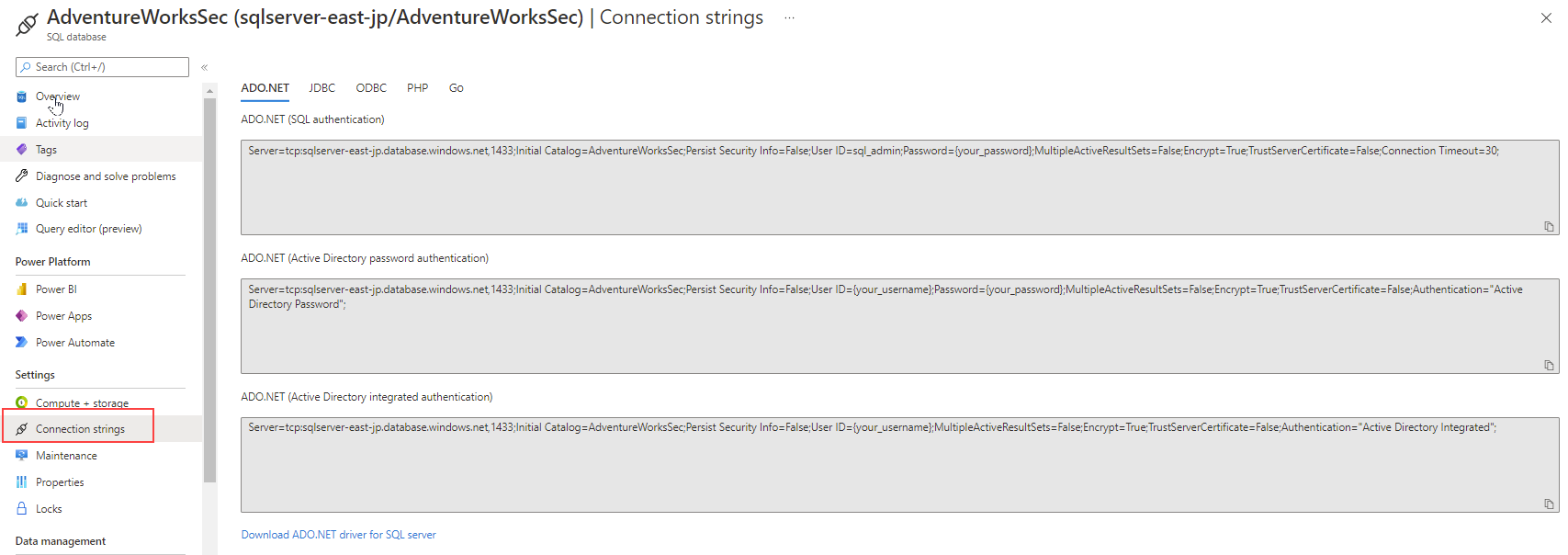 Kopieer en bewerk de verbindingsreeks door uw wachtwoord op te slaan of de servernaam indien nodig te vervangen.