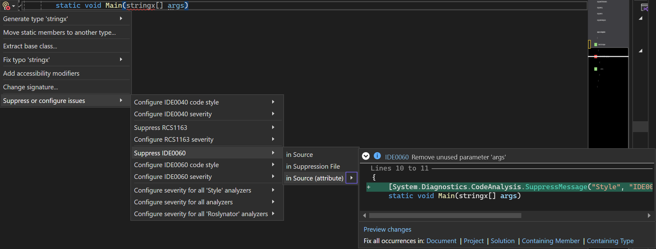 Wanneer u waarschuwingen ziet in Visual Studio, kunt u voorbeelden SuppressMessageAttribute bekijken door een onderdrukking toe te voegen aan het globale onderdrukkingsbestand. Het onderdrukkingskenmerk en de vereiste eigenschappen worden weergegeven in een voorbeeldvenster.