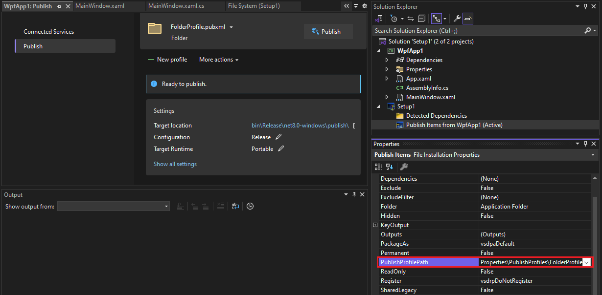 Als u een zelfstandig installatieprogramma wilt maken, stelt u de eigenschap PublishProfilePath in op het knooppunt Publiceer Items in het installatieproject, door gebruik te maken van het relatieve pad van een publicatieprofiel met de juiste ingestelde eigenschappen.