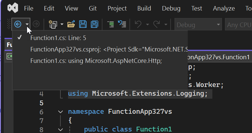 In Visual Basic-codebestanden kunt u de opdrachten Volgende methode en Vorige methode gebruiken om de invoegpositie naar verschillende methoden te verplaatsen. SelecteerVolgende methode> ofVorige methode>.
