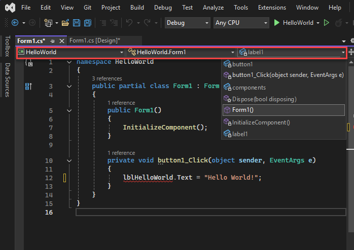 U kunt de navigatiebalk (de vervolgkeuzelijsten boven aan het codevenster) gebruiken om naar code in een codebasis te navigeren. U kunt een type of element selecteren om rechtstreeks naar dat type of element te gaan. De navigatiebalk wordt weergegeven wanneer u code bewerkt in een Visual Basic-, C#- of C++-codebasis. In een gedeeltelijke klasse zijn leden die buiten het huidige codebestand zijn gedefinieerd mogelijk uitgeschakeld (grijs weergegeven).