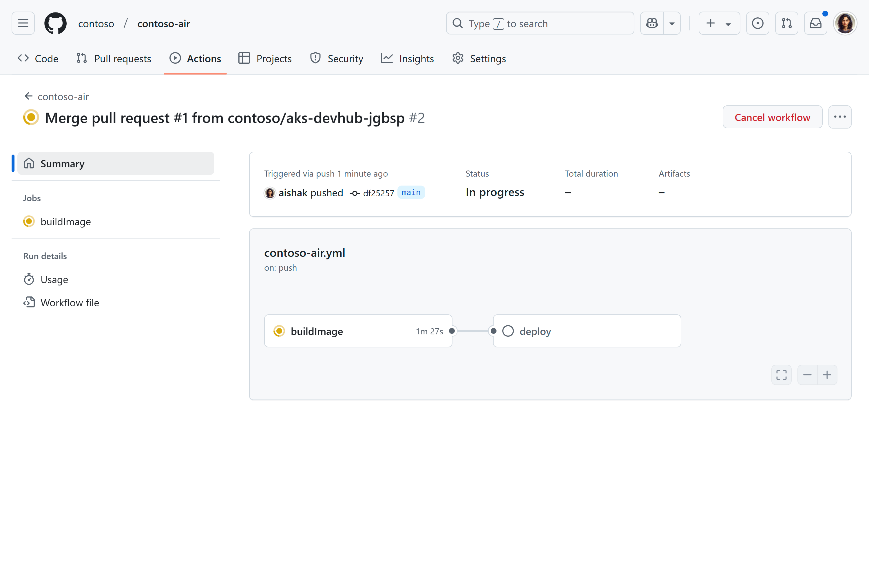 Als u de wijziging samenvoegt, wordt de GitHub Actions-werkstroom uitgevoerd die uw toepassing bouwt tot een containerafbeelding, deze opslaat in Azure Container Registry en implementeert in het cluster.