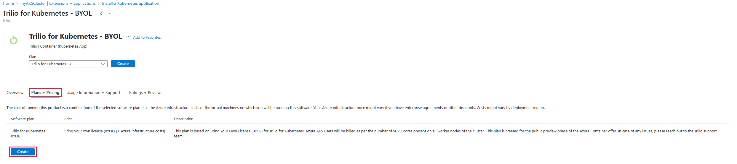 Select Plans + Pricing to ensure the terms are acceptable, and then select Create.