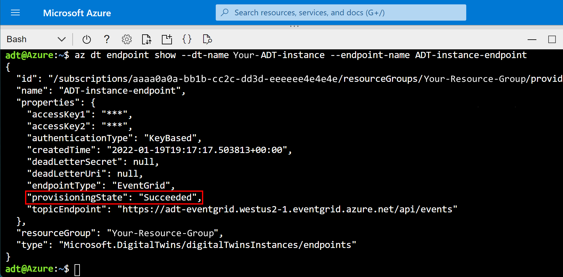az dt endpoint show --dt-name <your-Azure-Digital-Twins-instance> --endpoint-name <your-Azure-Digital-Twins-endpoint>