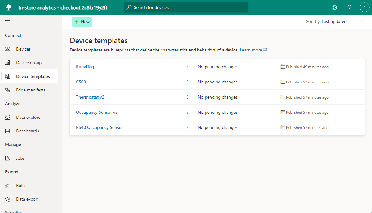De In-store analytics - uitchecktoepassingssjabloon heeft verschillende voorgedefinieerde apparaatsjablonen. De RuuviTag-apparaatsjabloon is niet opgenomen in de in-store-analyse- betaaltoepassingssjabloon .