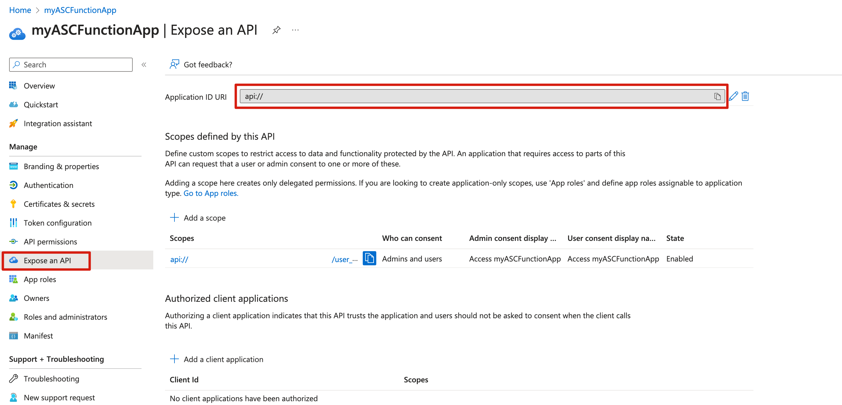 Als u de URI voor de toepassings-id wilt ophalen, selecteert u Een API beschikbaar maken in het navigatiedeelvenster en kopieert u de waarde van de URI van de toepassings-id.
