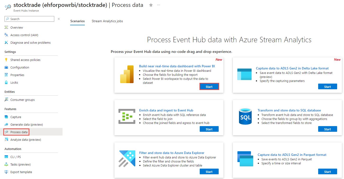 Selecteer Functies>procesgegevens en selecteer vervolgens Starten op het dashboard voor bijna realtime gegevens bouwen met de Power BI-kaart.