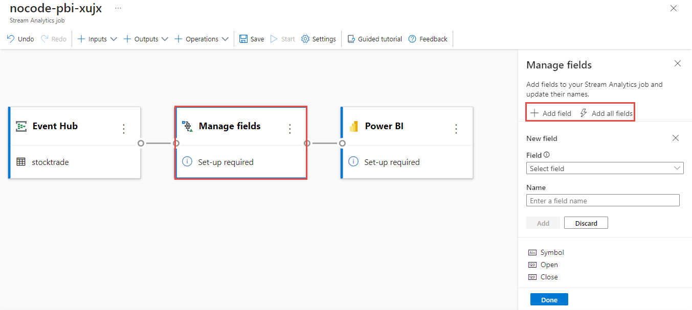 In dit artikel wordt beschreven hoe u de code-editor zonder code kunt gebruiken om eenvoudig een Stream Analytics-taak te maken voor het produceren van verwerkte gegevens in power BI-gegevensset. Het leest continu vanuit uw Event Hubs, verwerkt en voert de gegevens uit naar de Power BI-gegevensset om het realtime Power BI-dashboard te bouwen.