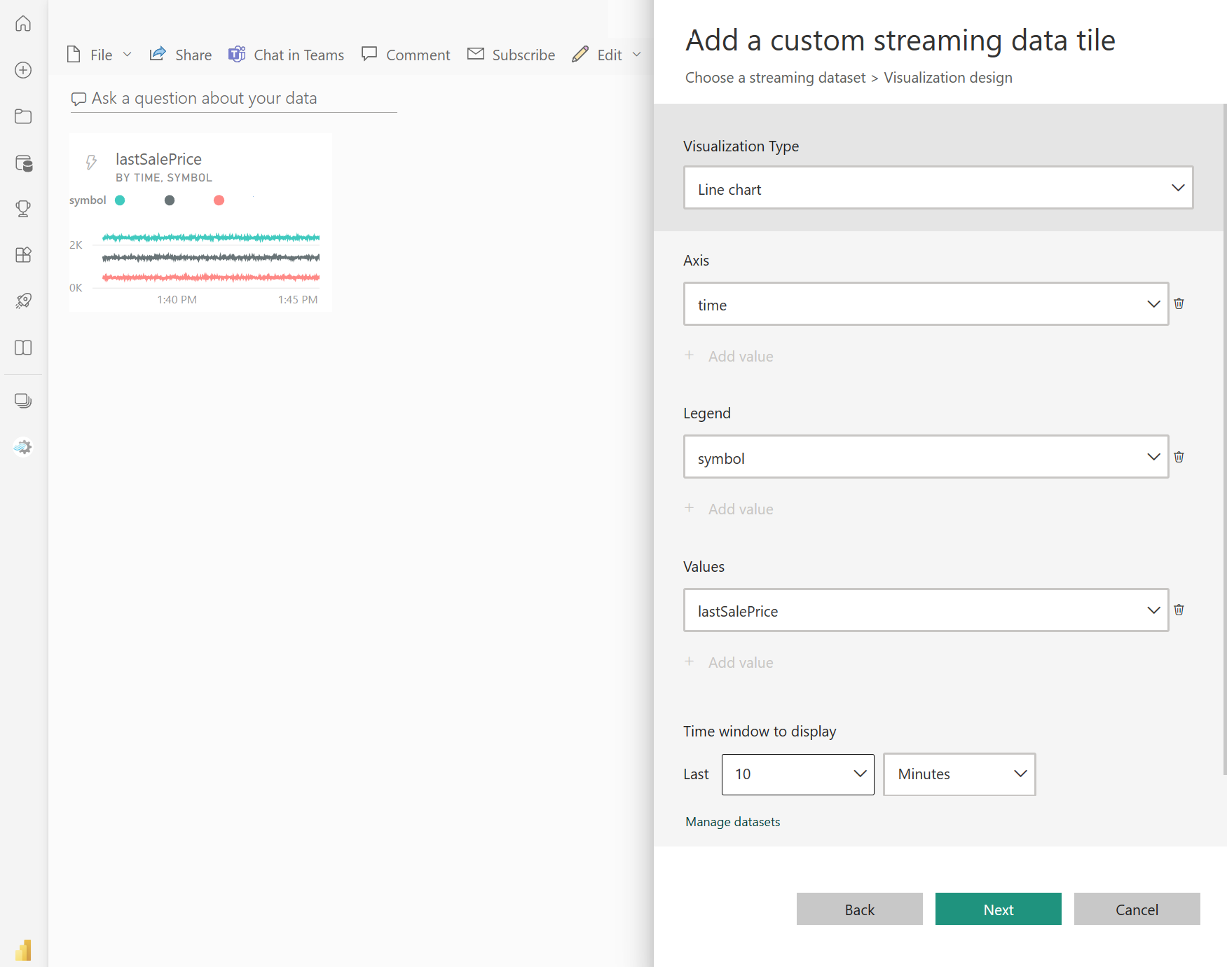 - Selecteer de streaminggegevensset (bijvoorbeeld nocode-pbi-demo-xujx) die u hebt geconfigureerd in het Power BI-knooppunt en ga naar de volgende pagina.