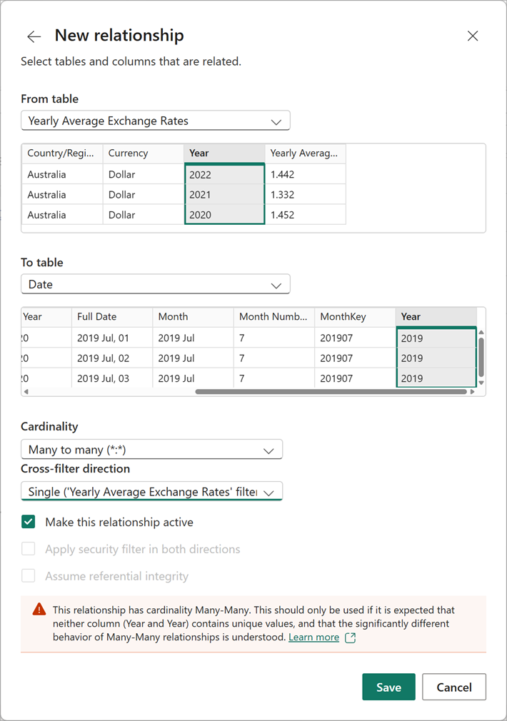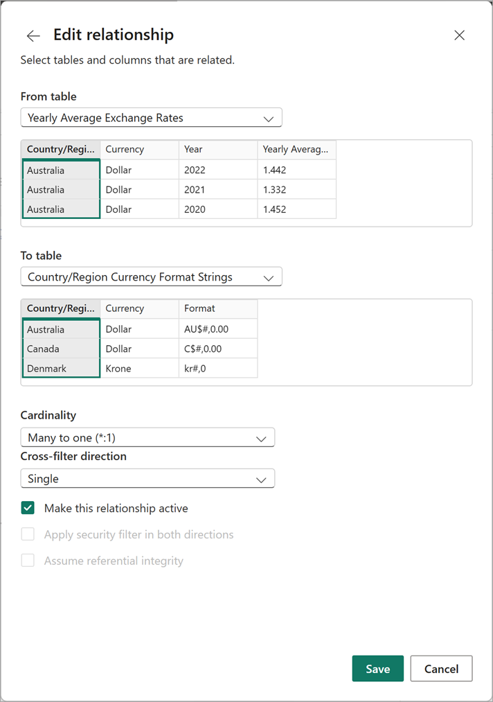 Maak relaties tussen de tabellen Jaar-gemiddelde wisselkoersen en valutatabellen land/regio, en tussen de tabel Jaarlijkse gemiddelde wisselkoersen en de bestaande tabel Datum.