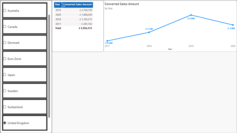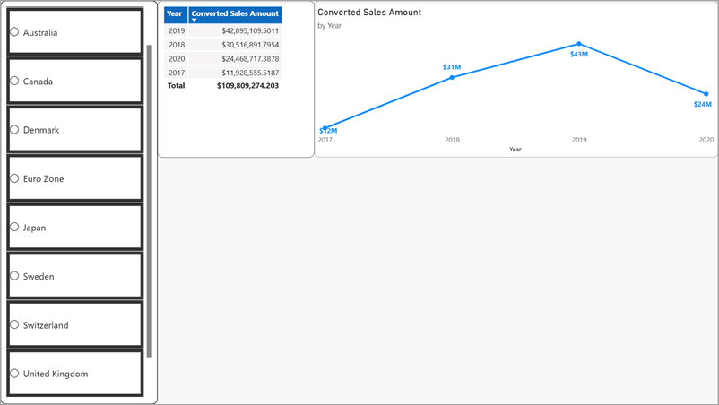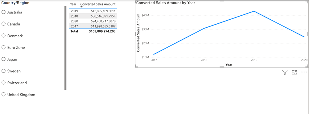 Selecteer een ander land/andere regio in de slicer. In de tabel- en lijndiagramvisuals wordt nu het geconverteerde valutabedrag weergegeven, in de juiste indeling, voor dat land/regio of die regio. Selecteer een ander land/andere regio in de slicer om te zien hoe de visuals veranderen.