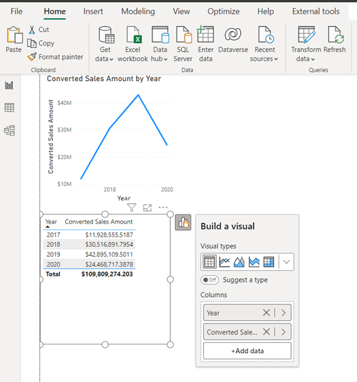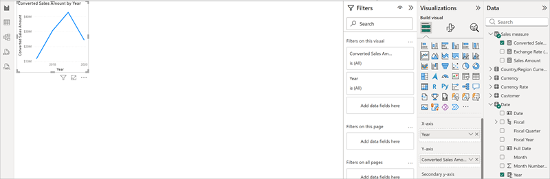 Selecteer Geconverteerde verkoophoeveelheid in het deelvenster >. Als u ergens anders niet hoeft te selecteren, selecteert u ook Year in de tabel Date .
