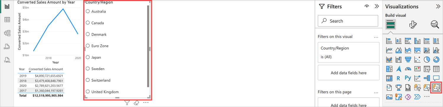 Voeg een slicervisual voor lijsten toe aan uw rapportpagina door de slicer Lijst te selecteren in het deelvenster Visualisaties . Selecteer in het deelvenster Gegevensde optie Land/regio in de tabel Valutanotatiereeksen voor land/regio om deze toe te voegen aan de slicer.