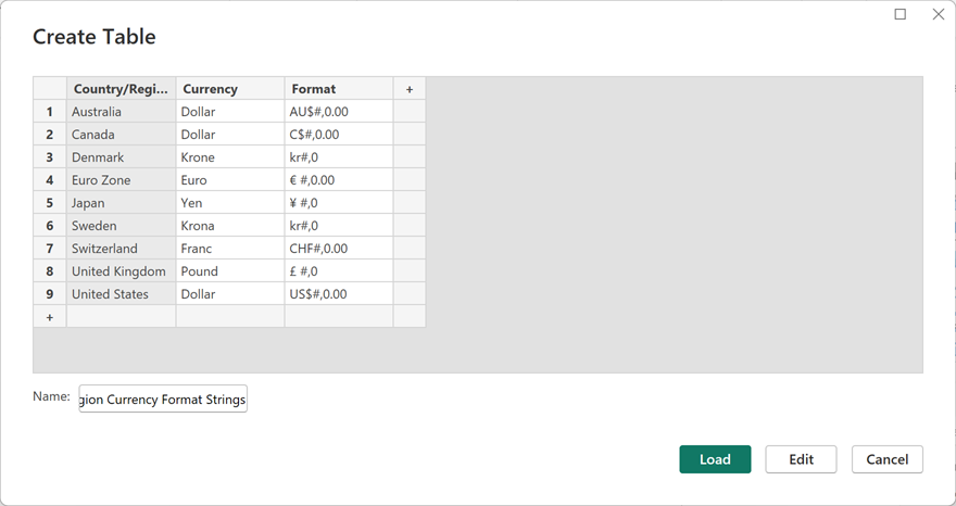 Voer in het dialoogvenster Tabel makentekenreeksen voor land-/regiovalutanotatie in het veld Naam in en kopieer en plak de volgende tabel: